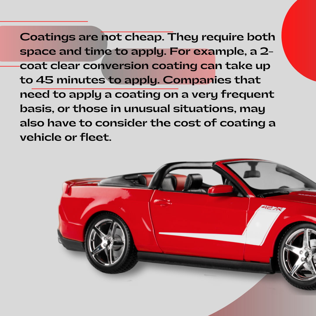 Coatings are not cheap. They require both space and time to apply. For example, a 2-coat clear conversion coating can take up to 45 minutes to apply. Companies that need to apply a coating on a very frequent basis, or those in unusual situations, may also have to consider the cost of coating a vehicle or fleet. These coatings are not something that you can simply slap on your car and be done with it. They must be applied correctly, and in some cases, the vehicle’s condition must be changed before the application process can begin. Coatings don’t just apply in a flash. They usually take 2–3 coats and up to 45 minutes to apply in a car. There are coatings that are more temperature sensitive than others, so they can be applied only during a certain season. Other coatings may require a specific paint code, so you may also be required to read any relevant regulations. Coating can be costly, so you don’t want to make a bad investment that doesn’t end up benefiting your company.