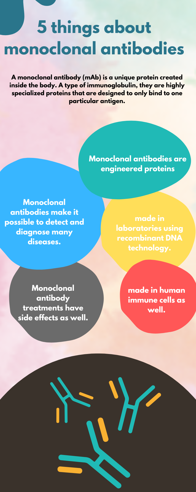 A monoclonal antibody (mAb) is a unique protein created inside the body. A type of immunoglobulin, they are highly specialized proteins that are designed to only bind to one particular antigen. The monoclonal antibodies are mostly Y shaped and they are complimentary with the shape of the binding site of the target antigen. This specificity allows them to target and treat specific diseases, making them a valuable medical tool.